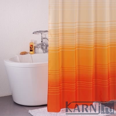Занавеска из 100% полиэстера для ванны с 12 металлическими люверсами под кольца. Штора обработана специальной пропиткой, отталкивающей воду.
